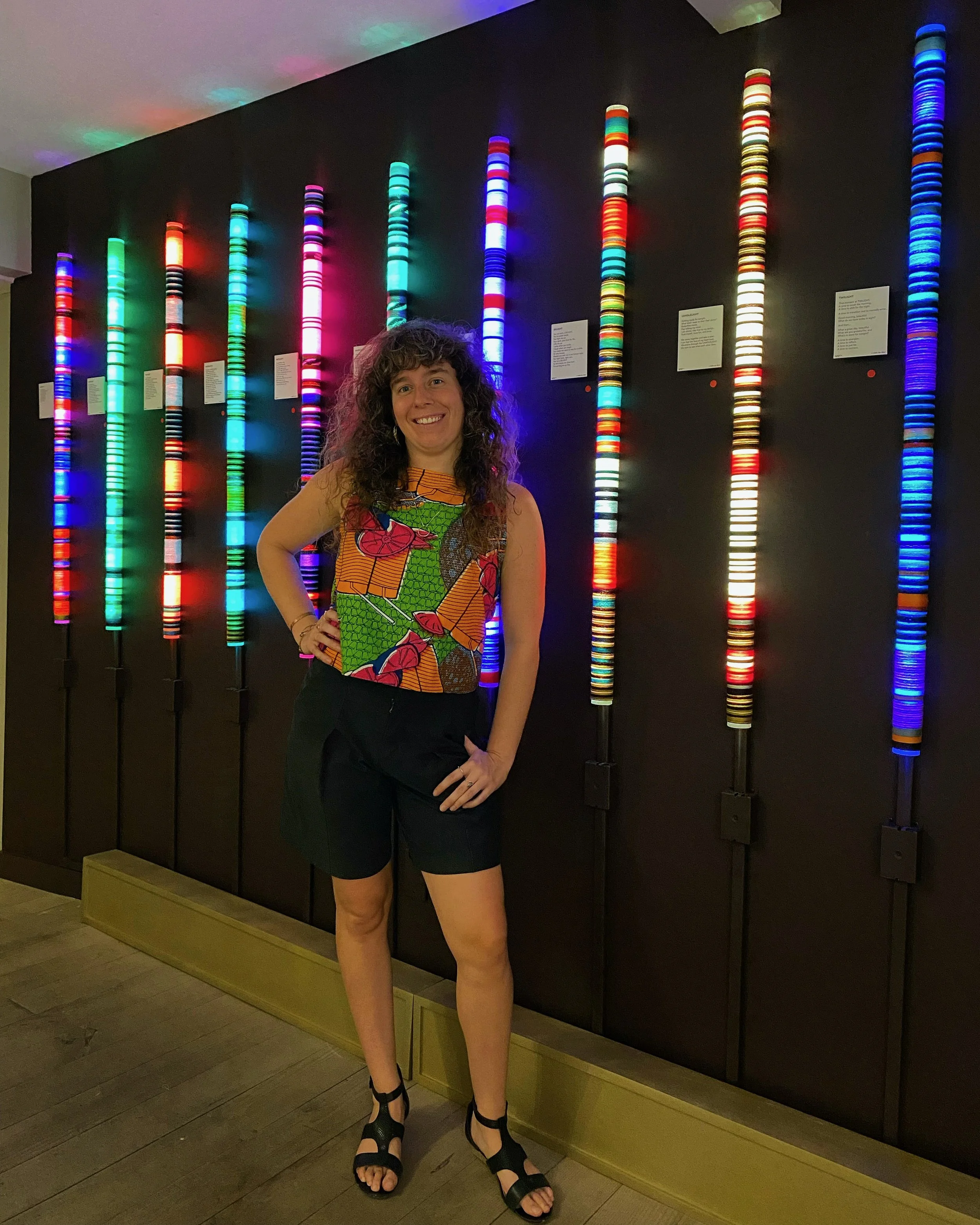 My artistic practice exudes positive energy, connectivity, and cleverness. I find inspiration and celebrate life through nature, the human experience, the power of words, and the multiple types of relationships that exist among these elements. Throughout my practice, my primary mediums include fiber, light, mixed media, and poetry, in addition to traditional techniques such as painting and printmaking. Much of my work is fiber-focused with the use of light, which radiates a positive glow, sometimes color-changing, bringing warmth, play, meditation, and movement to the viewer. Part of my creative practice embraces exploring my curiosity in thinking about the meaning of my artwork, and how I want to portray it through the different mediums that I choose to use.