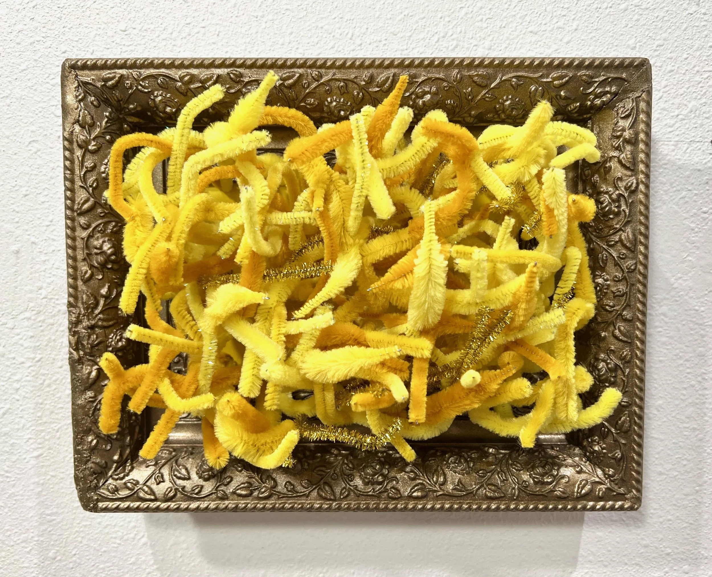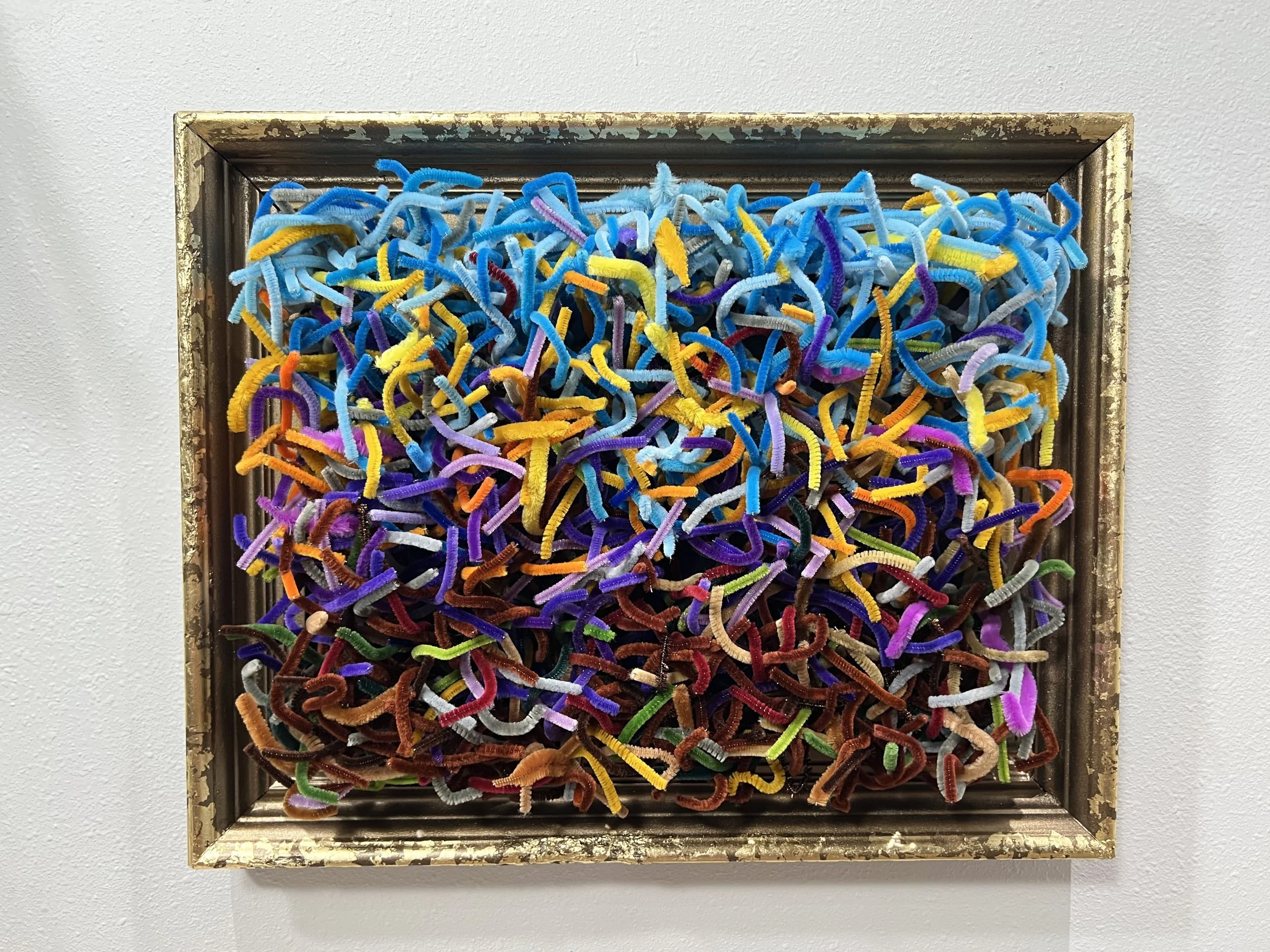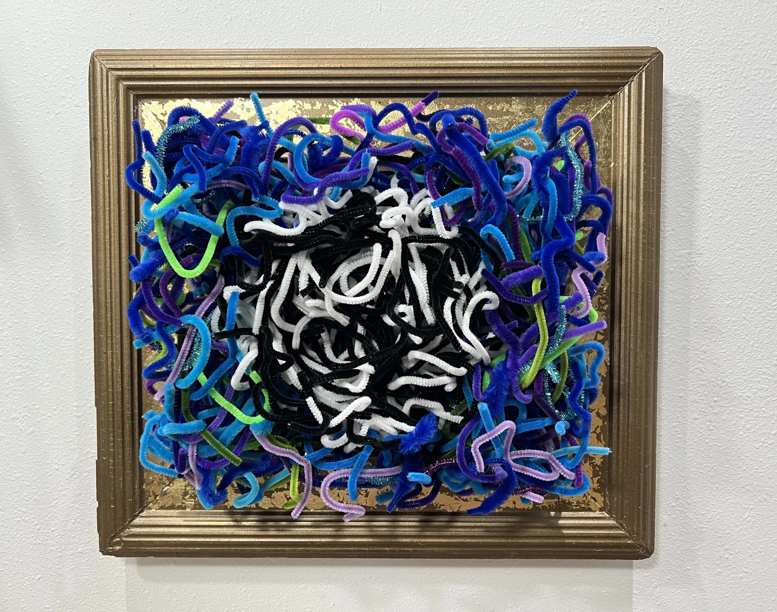 Pipe cleaners, pom poms, wood, metal sheet, metallic paint, & spray paint, and an accompanying poem.