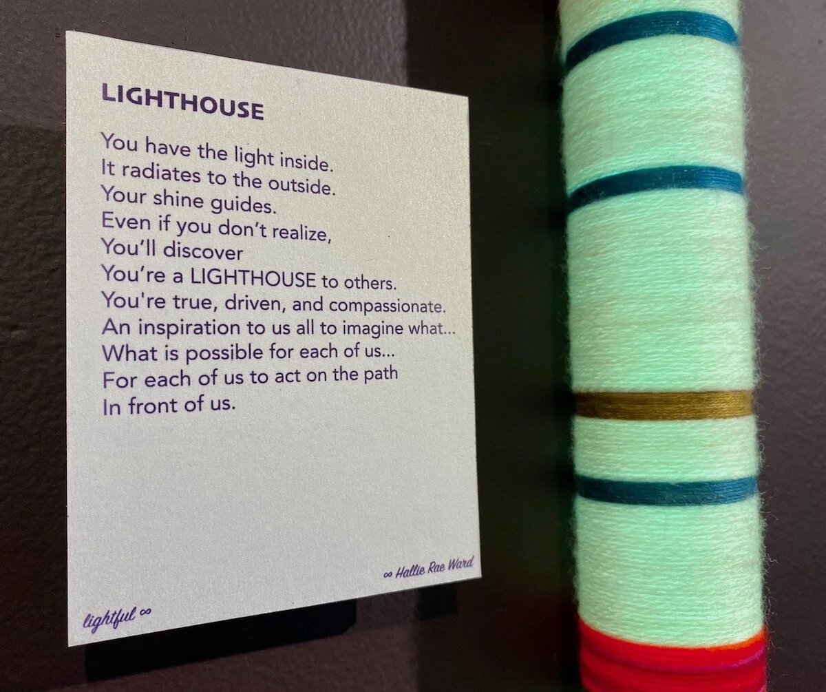 I express my feelings, reflections, and affirmations through fiber, light, and poetry. During the continuous journey of bringing these positive glow light beams to life, I contemplate on the way I live and move throughout my life. We have many deep relationships with oneself, with others, our thoughts, our flowing intentions, our experiences, and our union with nature. By way of the human connection, we share our stories that narrate what we understand, the lessons learned, deep down what we believe, our true feelings, and our past, present, and future beings. I choose to contribute energy and communicate my insights through creativity and positivity.